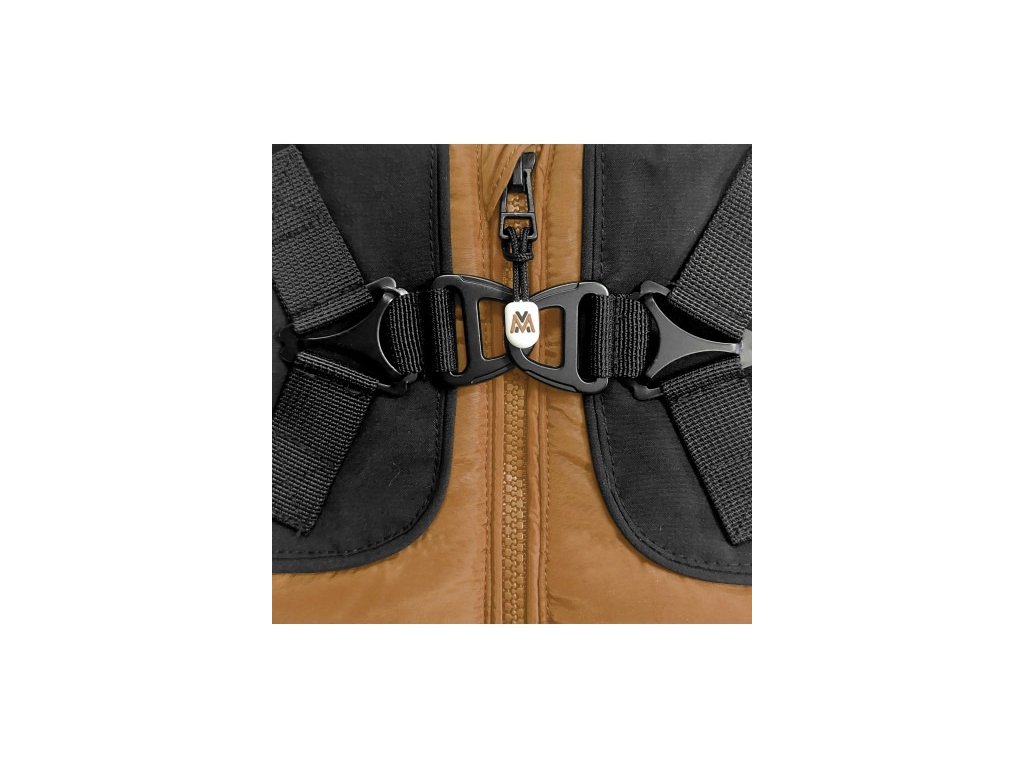 Horní část tvoří pevné černé keprové sedlo, které poskytuje stabilitu a bezpečné upevnění vodítka. Černé poutko a matně černé kovové přezky zajišťují spolehlivé připnutí a zároveň podtrhují módní charakter bundy.