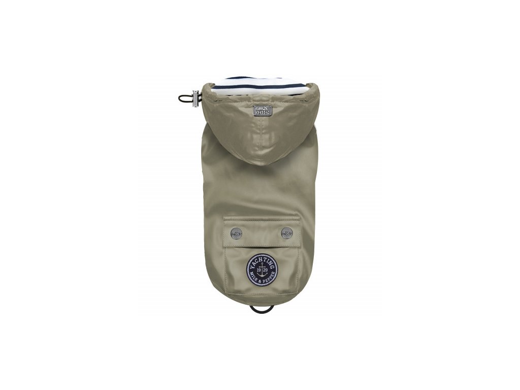 Pláštěnka pro psy je v barvě khaki, bez rukávů a s odnímatelnou kapucí na zip. Pláštěnka má bílou, námořnickou pruhovanou podšívku. V horní části zad je umístěna malá titanová destička s logem "Milk & Pepper". Na pláštěnce je výšivka z plsti a imitace kůže s tkaným odznakem "Yachting Milk & Pepper". Zapíná se na titanové patentky a zarážky kapuce. Pláštěnka má také elastické ouško na ocas. Na zádech je otevírání, které umožňuje snadné připnutí k postroji nebo obojku.