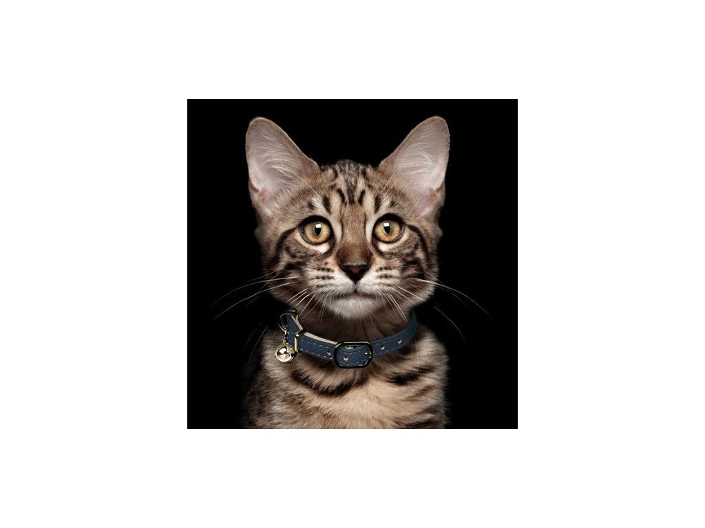 Obojek pro kočky z imitace námořnické kůže s podšívkou z imitace přírodní kůže v béžové barvě. obojek má voskované okraje, zlaté přezky a černou bezpečnostní gumičku. Obojek je zdobený malým zlatým zvonečkem, který pomáhá zjistit, kde se kočka nachází.