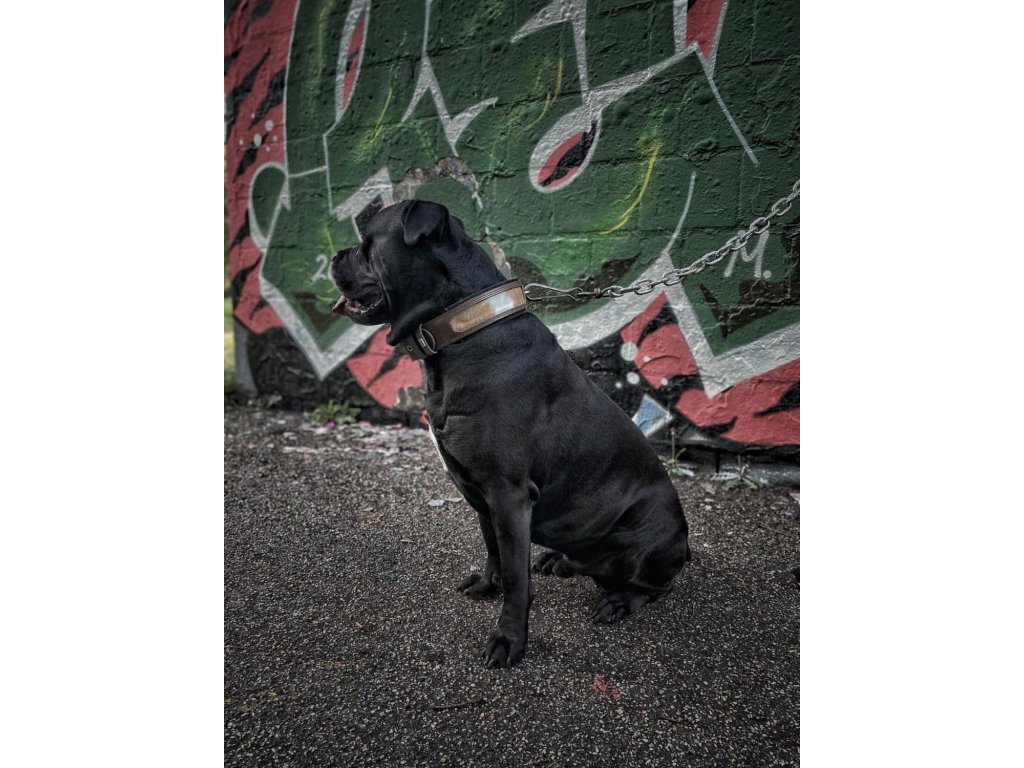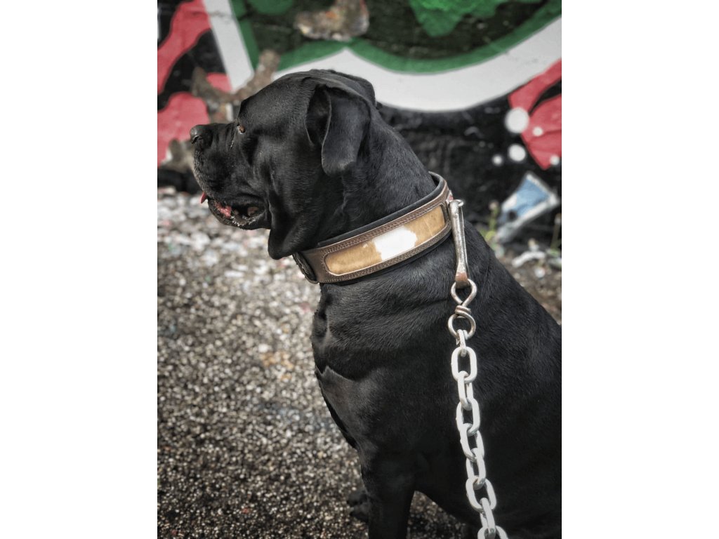 Základ tvoří 100% prvotřídní kůže, která byla přírodně vyčiněna s důrazem na kvalitu, odolnost a dlouhou životnost. Vnitřní strana je vybavena patentovaným ortopedickým polštářem, jenž se přizpůsobí krku psa a zajistí maximální pohodlí i při celodenním nošení.