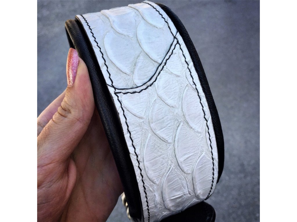 Obojek Dragon Scale je výrazným statement kouskem pro střední a velké psy. Jeho unikátní embosovaný povrch v imitaci dračí kůže z exkluzivní telecí kůže vytváří neodolatelně drsný a zároveň luxusní vzhled.