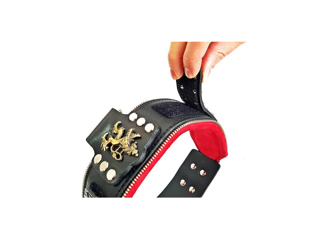 Masivní konstrukce je doplněna poniklovaným kováním nejvyšší kvality. Spona i D-kroužek o šířce 40 mm zajišťují bezpečné uchycení vodítka a bez problémů obstojí i při použití u tažných a pracovních psů. Pro velikosti M až XL je spona široká 35 mm, pro XXL 50 mm, což odpovídá nárokům na maximální pevnost a stabilitu.