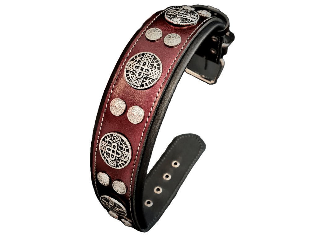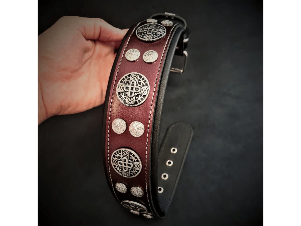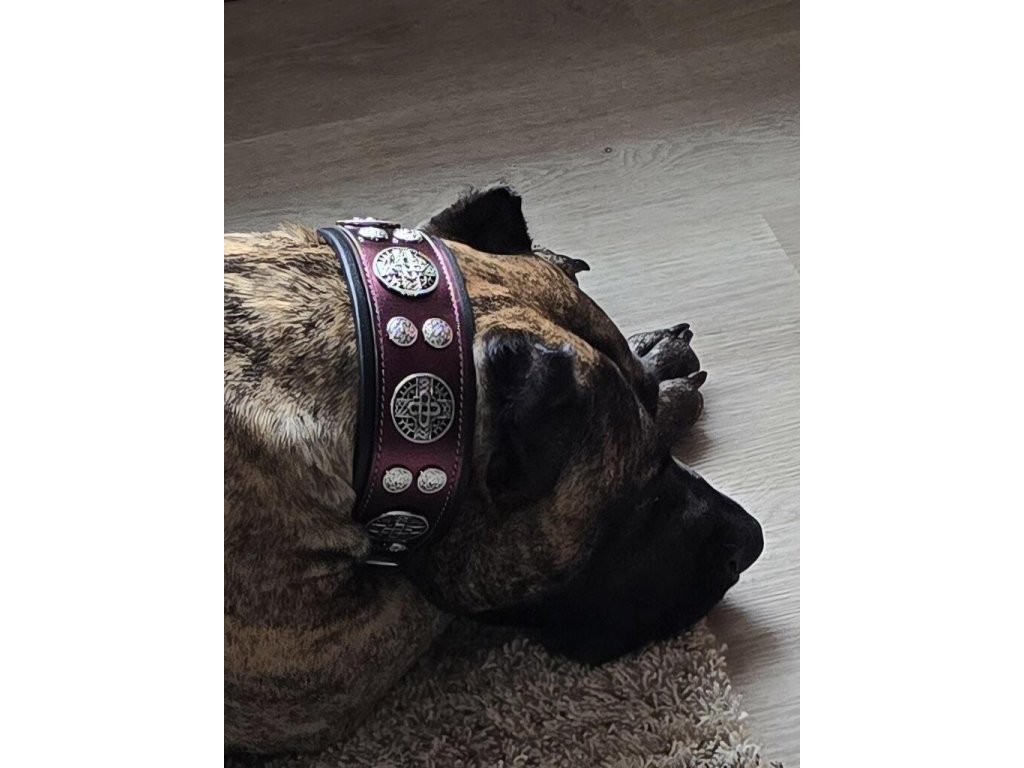Dekor tvoří masivní nýty ve stříbrné barvě – 5 až 7 velkých a 12 až 16 menších, které dodávají obojku charakter a výrazný vzhled. Celková šířka 6,3 cm poskytuje stabilitu a komfort i u větších plemen.