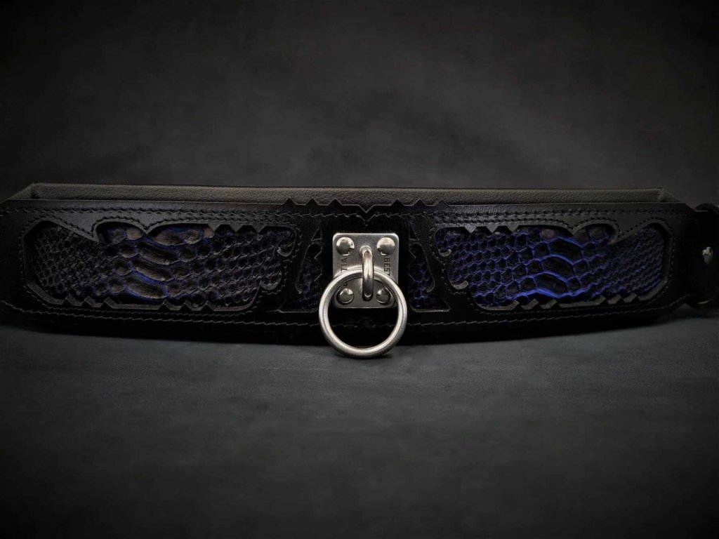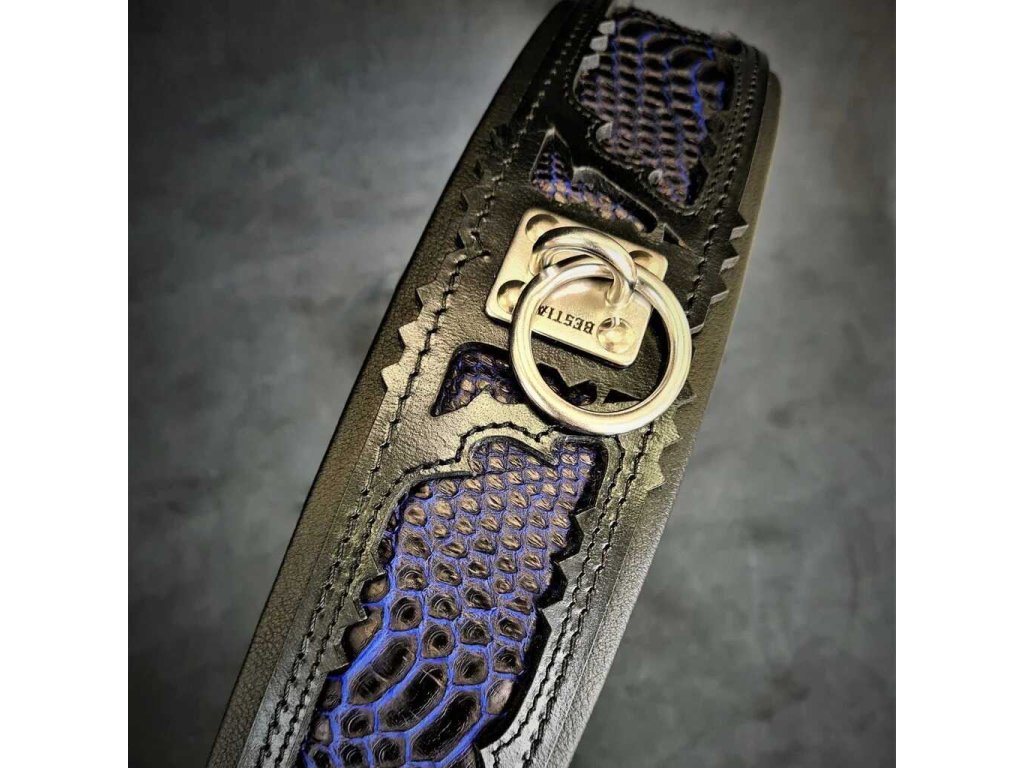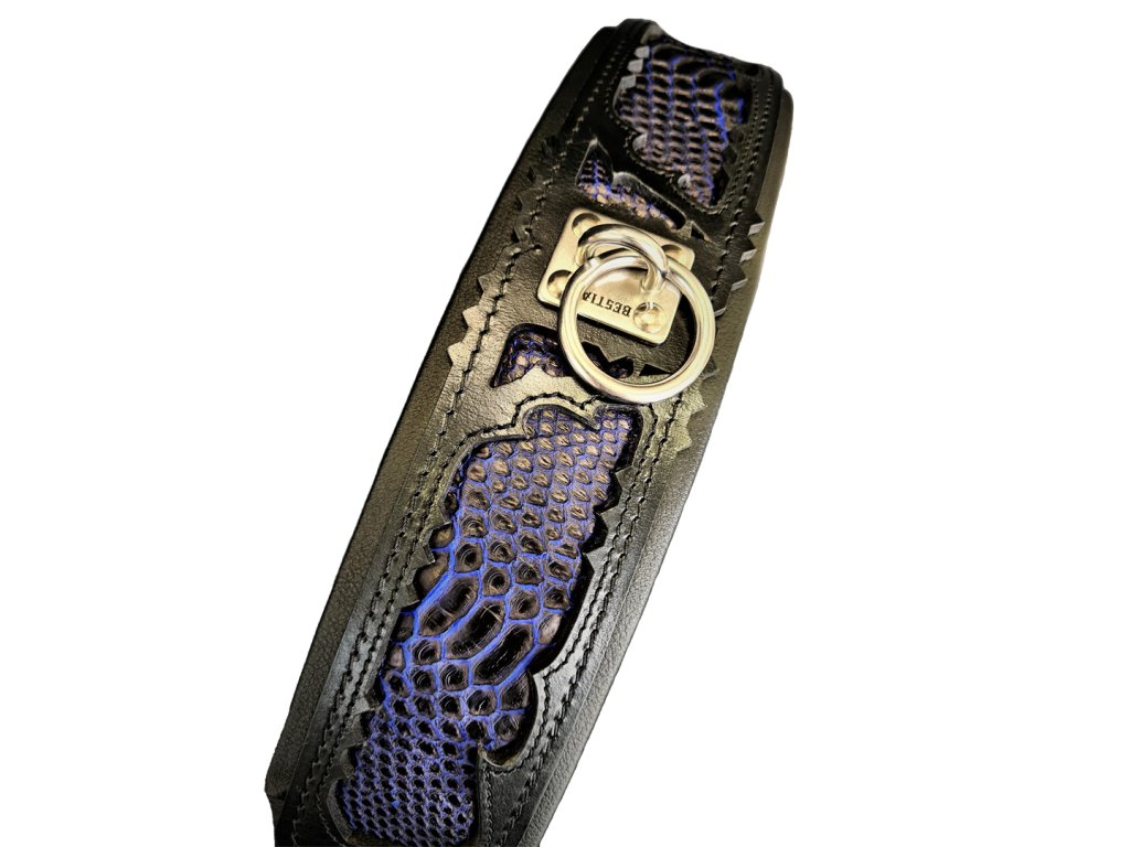 Luxusní kožený obojek „Indigo“ je symbolem elegance, síly a pohodlí pro střední až obří plemena psů. Každý kus je ručně vyrobený s důrazem na detail – kombinace černé pravé kůže a ručně malované dekorace z kůže krajty vytváří jedinečný, exkluzivní vzhled, který zaujme na první pohled.