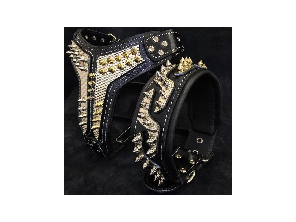 Základ tvoří černá módní kůže, která je pevně spojena s vrchní dekorativní vrstvou a vytváří exkluzivní vzhled. Obojek zdobí 12 mm dlouhé šroubovací hroty ve dvou luxusních odstínech – poniklovaná stříbrná a mosazná zlatá – které dodávají obojku silový a rockový charakter.