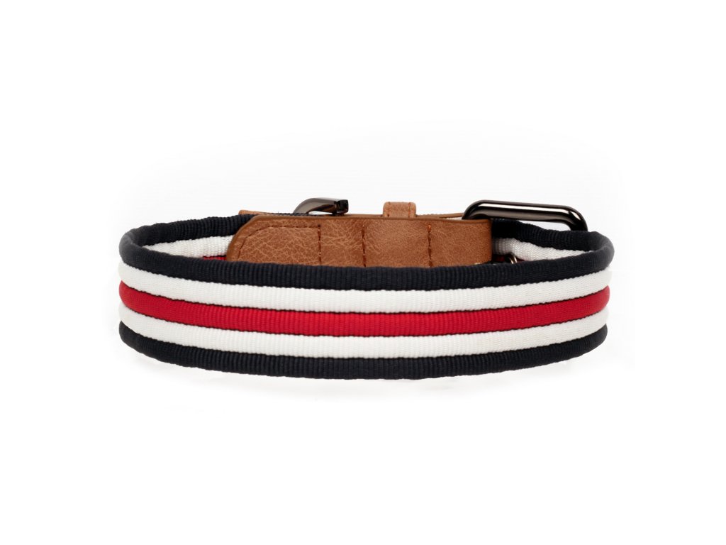 Obojek pro psy Heritage zaujme svým nadčasovým tříbarevným designem, který kombinuje odolný nylon s detaily z velbloudí imitace vintage kůže a vytváří tak elegantní, ale zároveň praktický doplněk pro každodenní nošení. Barevná kombinace černé, bílé a červené dodává obojku výrazný charakter inspirovaný klasickým stylem, který nikdy nevyjde z módy. Tento designový psí obojek je ideální pro majitele, kteří hledají styl, komfort i spolehlivost v jednom.