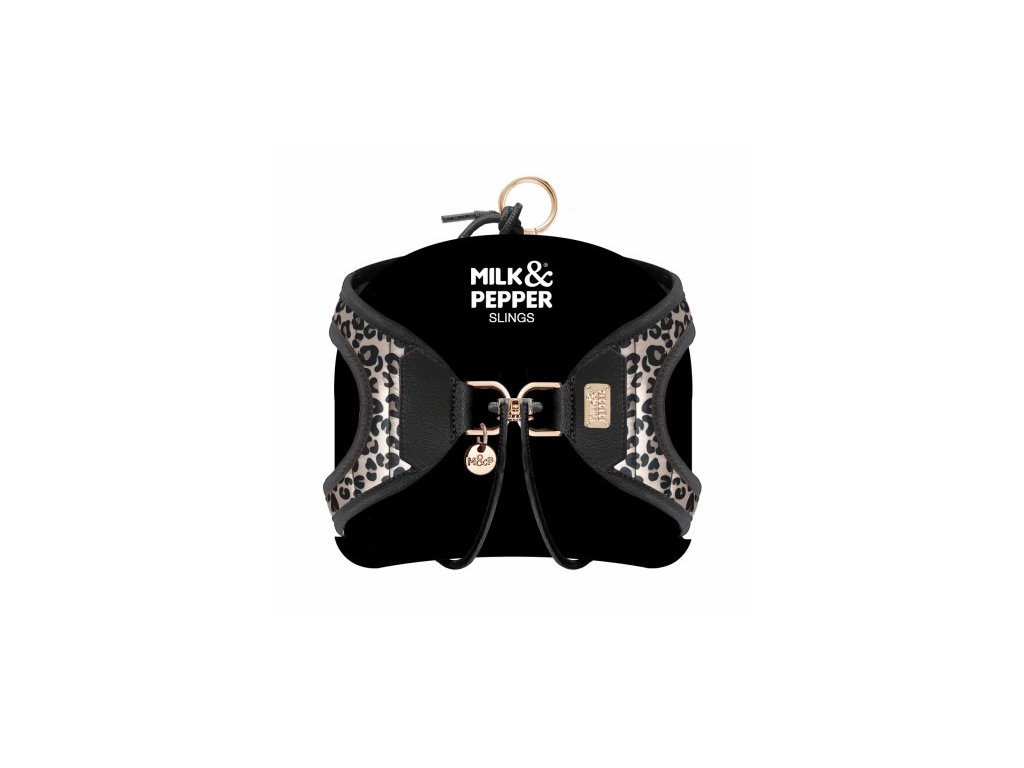 Elegantní psí postroj s prošívaným leopardím vzorem v černých a taupe tónech je ideální pro malé a střední psy, kteří chtějí vypadat stylově a zároveň se cítit pohodlně. Odolný polyester s vodoodpudivou úpravou chrání před vlhkostí, zatímco měkká podšívka z černého sametu poskytuje maximální komfort při každé procházce. Detaily z černé koženky na bočních záplatách a lemech dodávají postroji luxusní vzhled, který podtrhují černé voskované bavlněné krajky. Zlatá přezka a plaketa „Milk & Pepper“ pak završují prémiový design a zajišťují bezpečné a pohodlné zapínání.