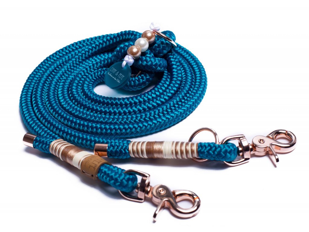 Vodítko pro psa nemusí být jen kus lana se smyčkou. Jsme přesvědčeni, že něco praktického může být i něco stylového. Vodítka přesvědčí jednoduchou elegancí na jedné straně a robustností na straně druhé. S kroužky zauzlenými v laně jsou třícestně nastavitelné a můžete se rozhodnout, kolik volného prostoru by měl váš miláček mít. Buďte věrní woof efektu, na každém vodítku najdete malý perlový přívěsek, který odráží motiv obojků. Různé velikosti psů mají různé potřeby. Naše vodítka se proto liší silou lana a karabiny, takže pro každé plemeno psa je vytvořeno optimální vodítko.